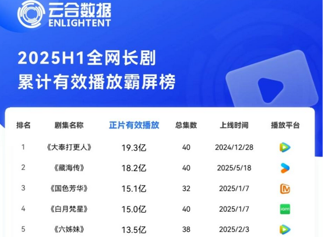 酷云数据则显示,梅婷、陆毅主演的《六姊妹》热播期累计全端播放量33.73亿,位列2025年上半年榜单第一;由肖战、张婧仪主演的《藏海传》热播期累计全端播放量27.66亿,排名第二;孙俪、董子健主演的《蛮好的人生》热播期累计全端播放量22.25亿,排名第三。而酷云数据2024年上半年的数据则显示,《庆余年第二季》播放量高达47.16亿,《南来北往》以31.97亿排在第二,排在第三的《与凤行》也高达29.84亿。