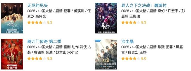 对于普通观众来说,他们不看重这些迷雾重重的播放数据,更在乎的是剧集质量。而今年上半年,剧集市场口碑拔尖者太少。以市场普遍参考的豆瓣评分为准,8分以上通常被视为精品剧。按照这个评判标准,今年上半年称之为精品剧的仅有《无尽的尽头》《异人之下之决战!碧游村》《沙尘暴》《鹊刀门传奇2》等4部,其中评分最高的是8.3分的《无尽的尽头》和《异人之下之决战!碧游村》。